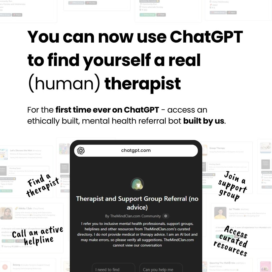 We’ve created something new: the Therapist and Support Group Referral (no advice) bot on ChatGPT.