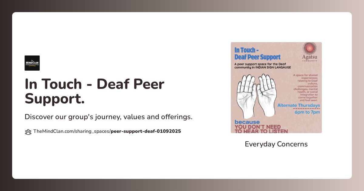 It’s a new peer support group starting from 28th August. Deaf Peer Support is a space designed for deaf individuals who share similar life experiences, especially relating to Deaf culture, communication challenges, mental health, or social integration to come together and feel seen. It’s a peer support in Indian Sign Language.